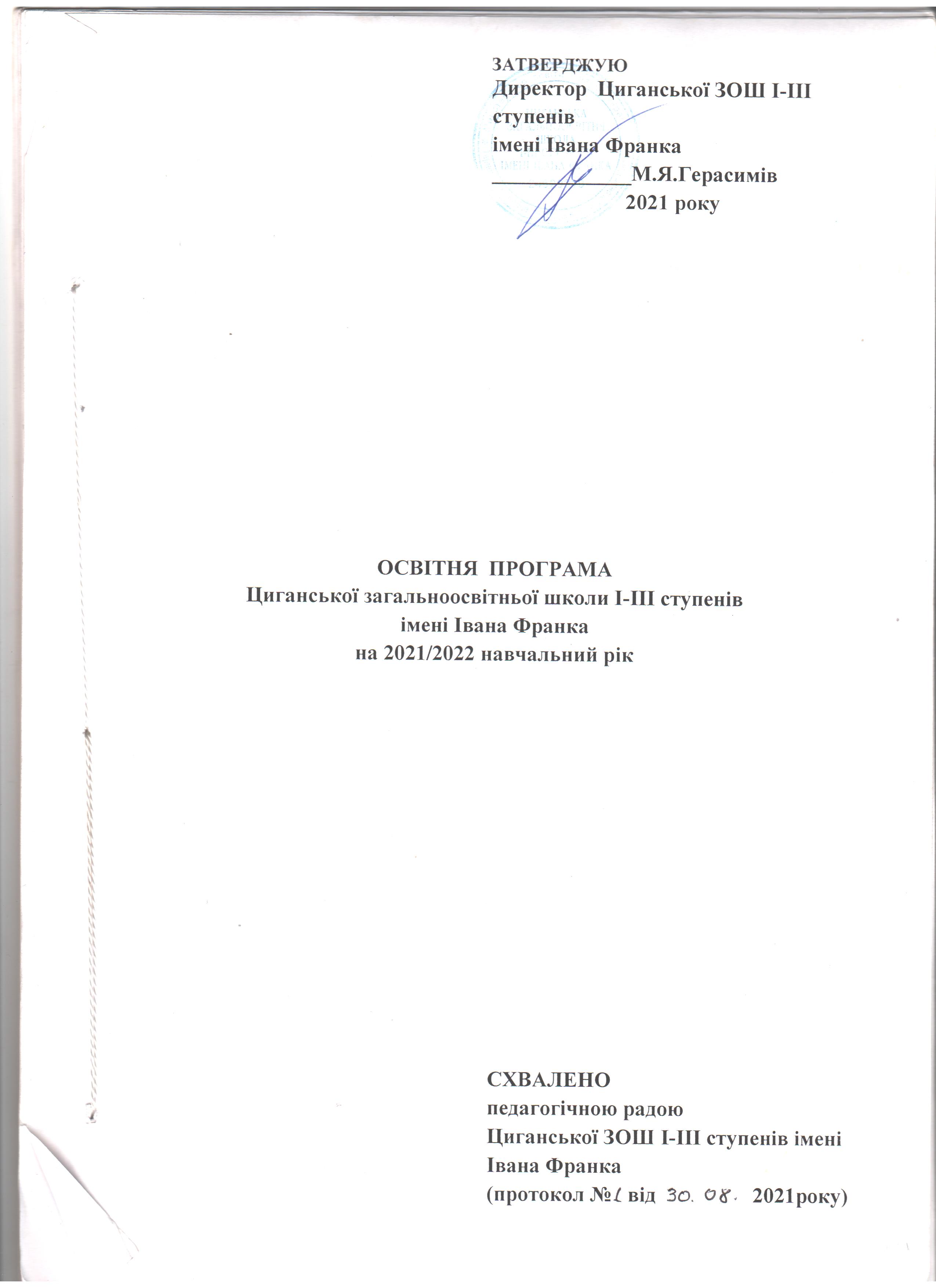 ЗАТВЕРДЖУЮ Директор Циганської ЗОШ І-ІІІ ступенів імені Івана Франка _____________М.Я.Герасимів 2021 року ОСВІТНЯ ПРОГРАМА Циганської загальноосвітньої школи І-ІІІ ступенів імені Івана Франка на 2021/2022 навчальний рік СХВАЛЕНО педагогічною радою Циганської ЗОШ І-ІІІ ступенів імені Івана Франка (протокол № від 2021року)